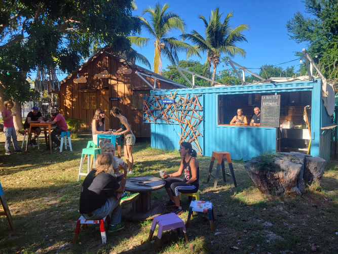 Ouverts lors des moments conviviaux et festifs du tiers-lieu, nous valorisons les producteurs et les produits de notre île, le fait-maison et le « faire-ensemble ». La grande majorité de notre carte est fabriquée sur place lors de nos chantiers, ateliers et permanences. Nous la voulons accessible, saine et surtout bonne.